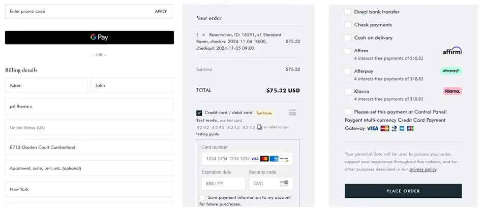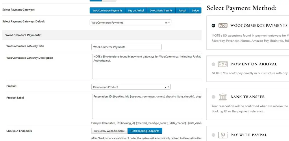 You need more or specific payments methods to book your accommodation? Use WooCommerce Payments to specific country with more than 100 extensions found in payment gateways as: PayPal, Square, Razorpay, Payoneer, Klarna, Amazon Pay, Braintree, Stripe, Authorize.net…